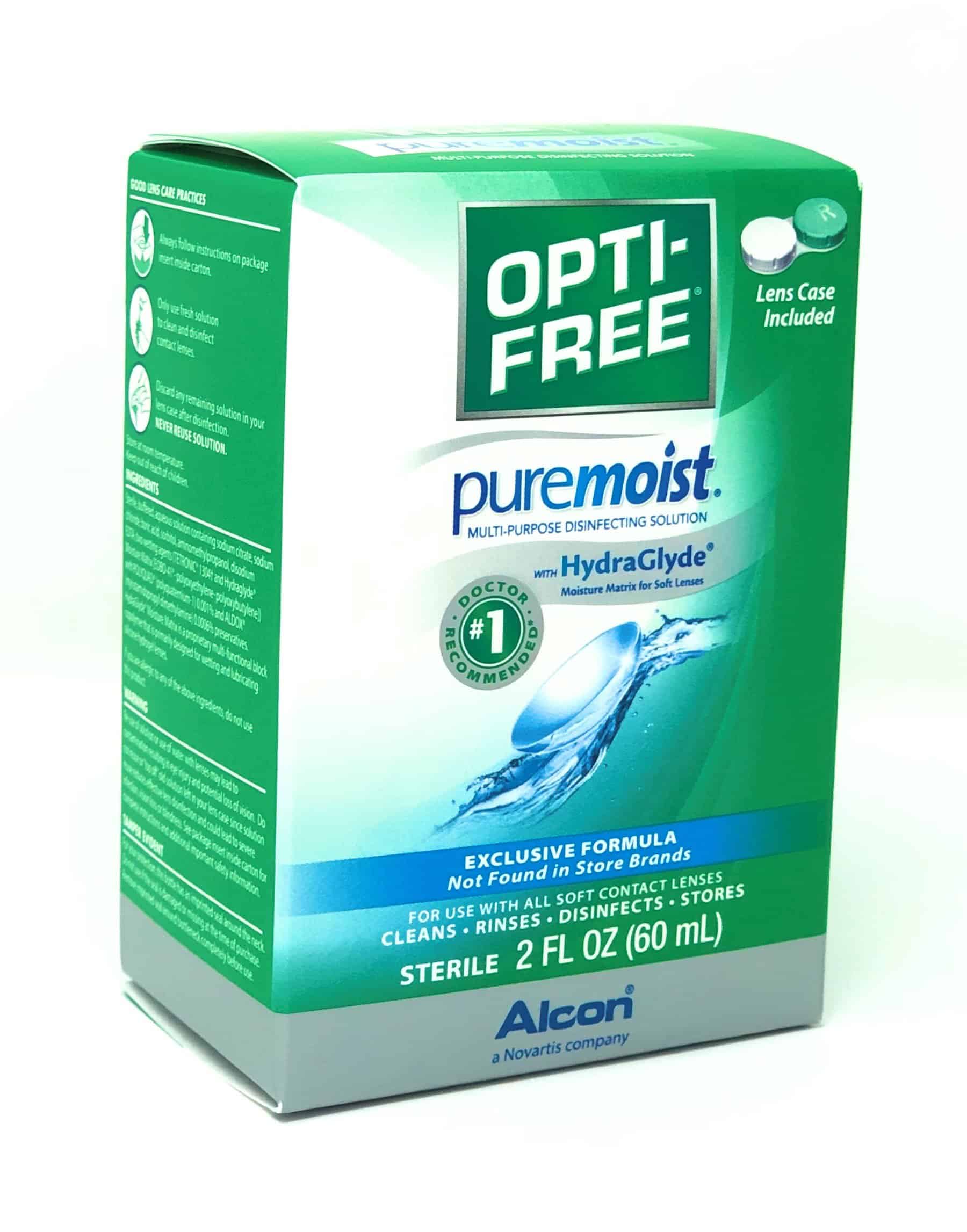 OPTI-FREE Puremoist multi-purpose disinfecting solution with HydraGlyde. #1 doctor recommended. Exclusive formula not found in store brands. Cleans • Rinses • Disinfects • Stores