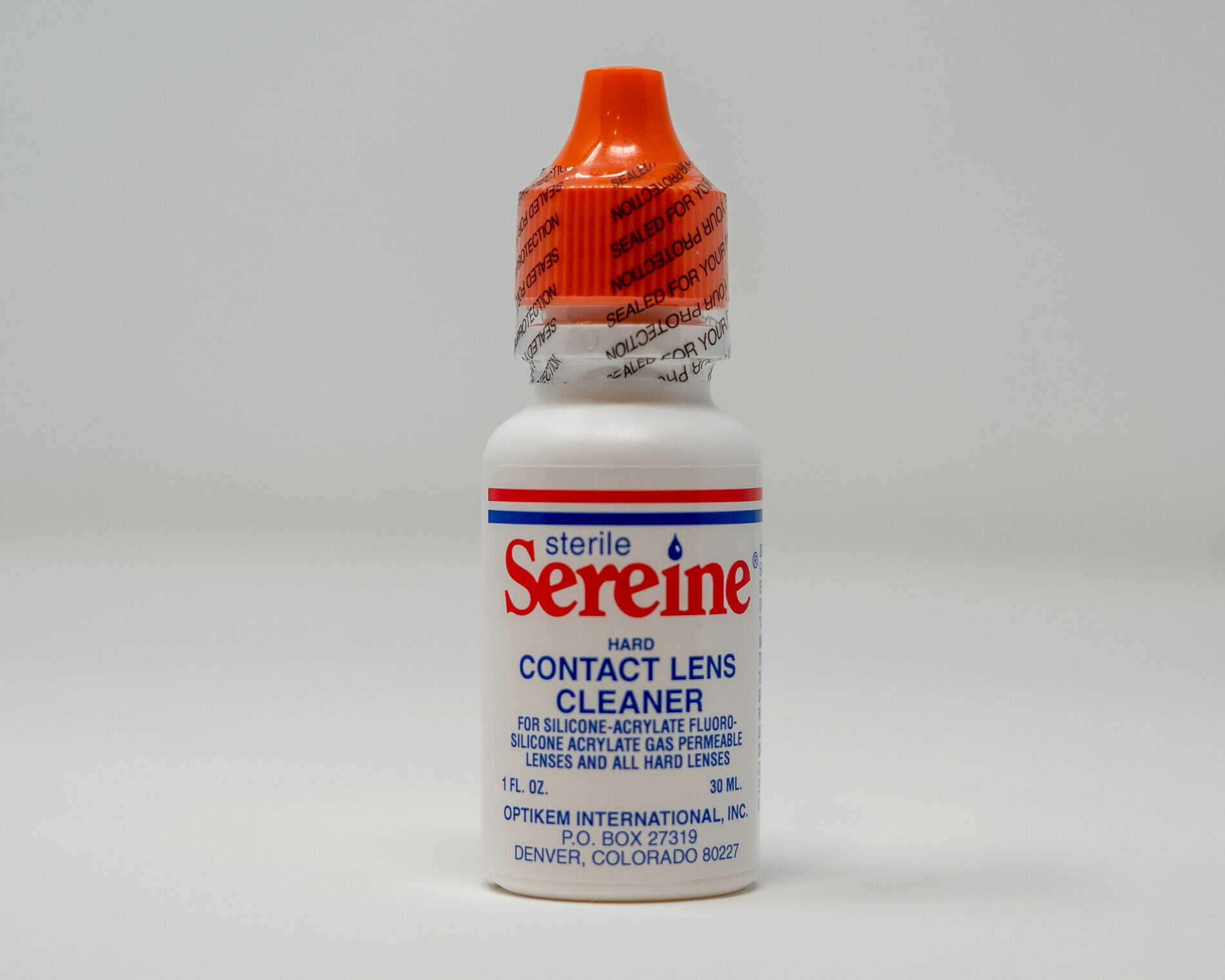 Sereine Contact Lens Cleaner removes surface deposits, grease, oils, and lipids from silicone-acrylate, fluoro-silicone acrylate rigid gas permeable lenses, and all hard lenses.