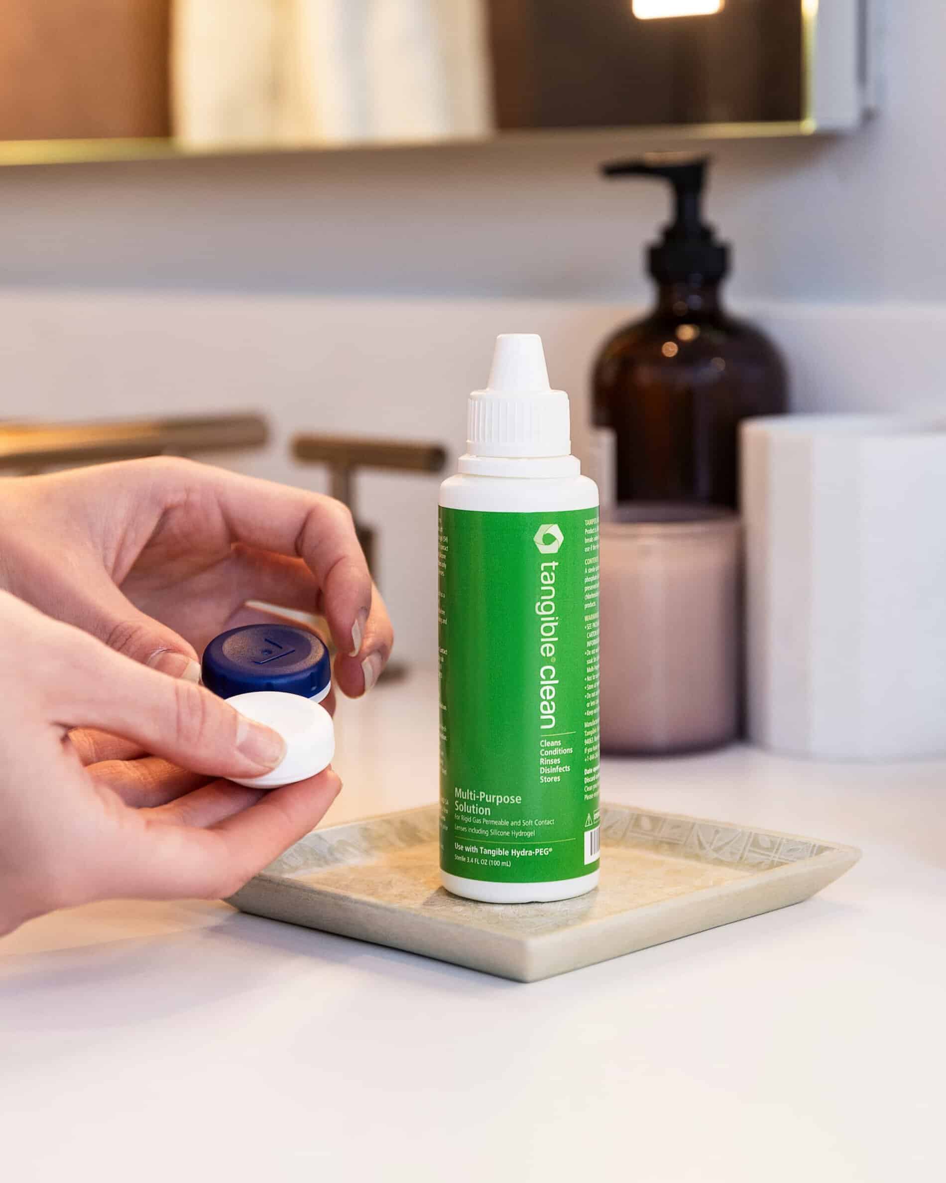 Tangible Clean is an FDA-cleared daily cleaning and disinfecting solution ideal for use with Tangible Hydra-PEG coated lenses that can also be used with any gas permeable lens. When you’re using Tangible Clean, you won’t have to worry about using an incompatible solution that might damage your coated lenses.